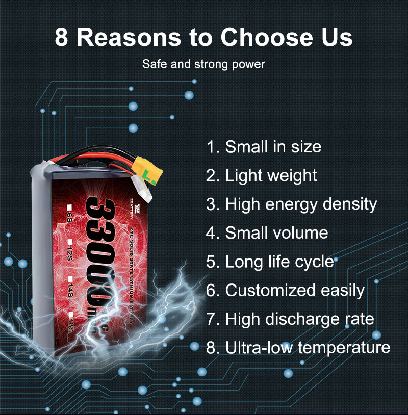 التكنولوجيا المتطورة: بطاريات الحالة الصلبة ذات الكثافة العالية وسلامة الطاقة ، بما في ذلكبطارية ليثيوم صلبة خفيفة الوزن 32000mAh 30000mAh 5C10C من السهل تخصيص 2S3S45S6S AAVS Packt.