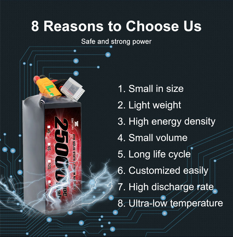 في Zye ، نحن لسنا فقط بناء البطاريات ؛ نحن نبني الثقة. مع أكثر من عقد من الخبرة في صناعة بطاريات الليثيوم ، قمنا بشحذ خبرتنا لتقديم المنتجات التي تتجاوز التوقعات. أحد هذه المنتجات هو لديناكثافة عالية الطاقة 22AH 20AH 22000MAH 10C 20C حزمة بطارية LI-ION STALT للطائرات الطائرات بدون طيار طويلة المدى، مصممة لتحقيق أقصى قدر من الكفاءة والتحمل في التطبيقات الصعبة.